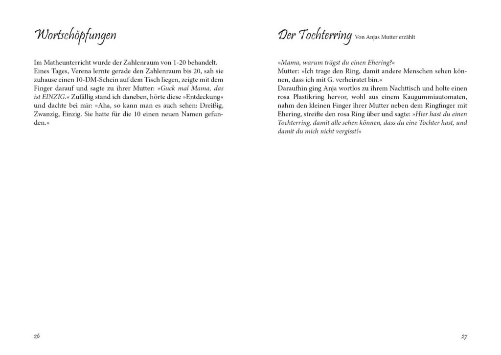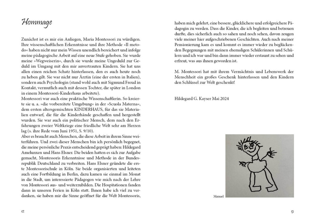 Kleine Geschichten von kleinen Menschen: Hildegard G. Kayser schildert Erlebnisse aus ihrem Leben und mit den ihr im Laufe ihres Berufslebens in Vorschule und Schule anvertrauten Kindern. Auf den Spuren Montessoris hat sie Erlebtes und Gehörtes in kleinen, feinen Geschichten zusammengetragen.